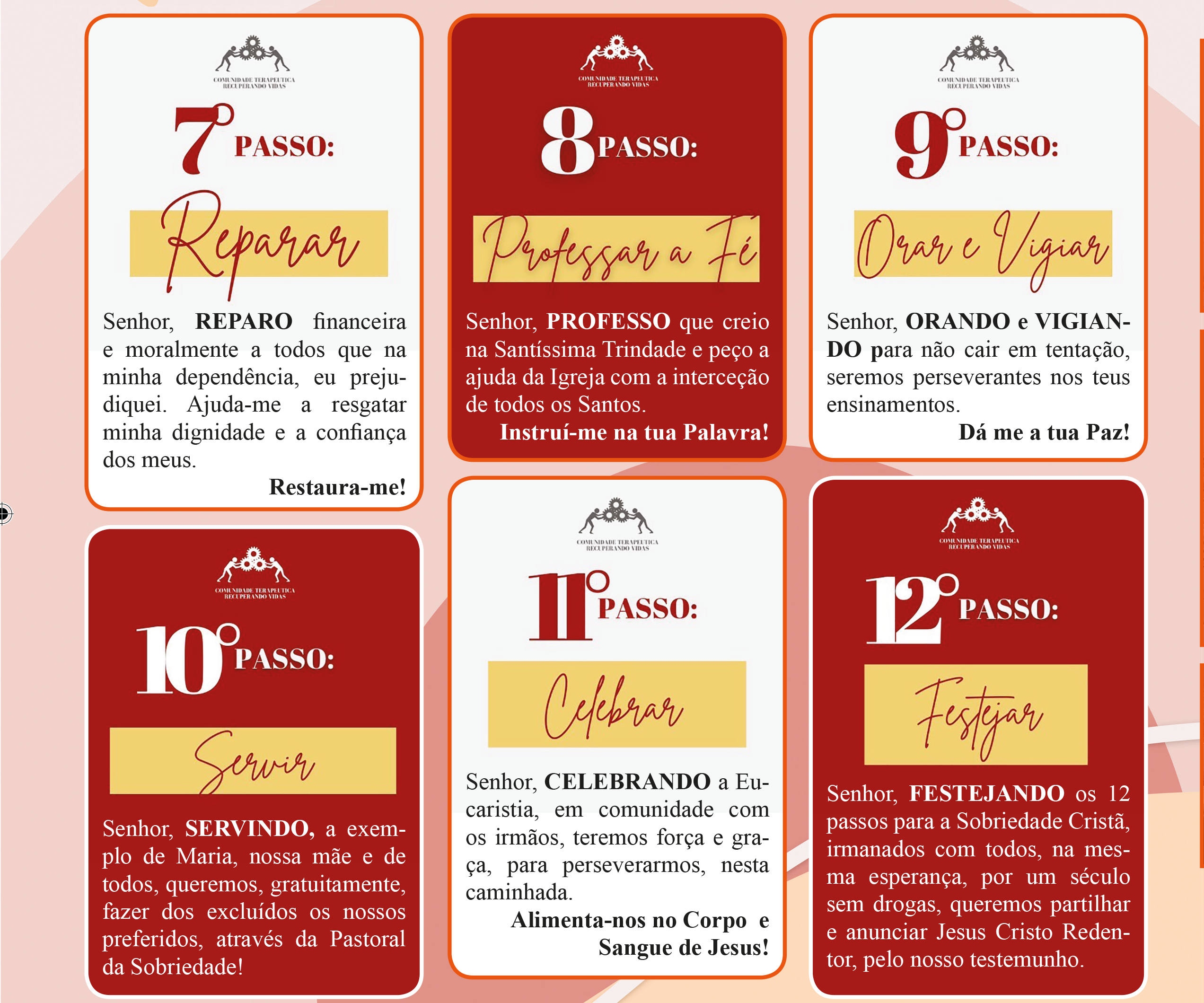 Na nossa comunidade seguimos os 12 passos da PASTORAL DA SOBRIEDADE com nossos assistenciados, vivenciando periodicamente e ciclicamente trazendo sempre a evangelização como primeira missão do nosso trabalho.